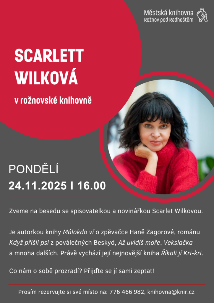 Beseda s autorkou románů Scarlet Wilkovou, dokumentaristkou a editorkou. Pro databázi Paměť národa zpracovala stovky příběhů pamětníků historických událostí. Je spoluautorkou projektu Vdovy vdovám. Za román Až uvidíš moře byla nominována na literární Cenu Jantar. A mimo jiné napsala román „Když přišli psi“ z poválečných Beskyd. Zveme na jedinečnou besedu.