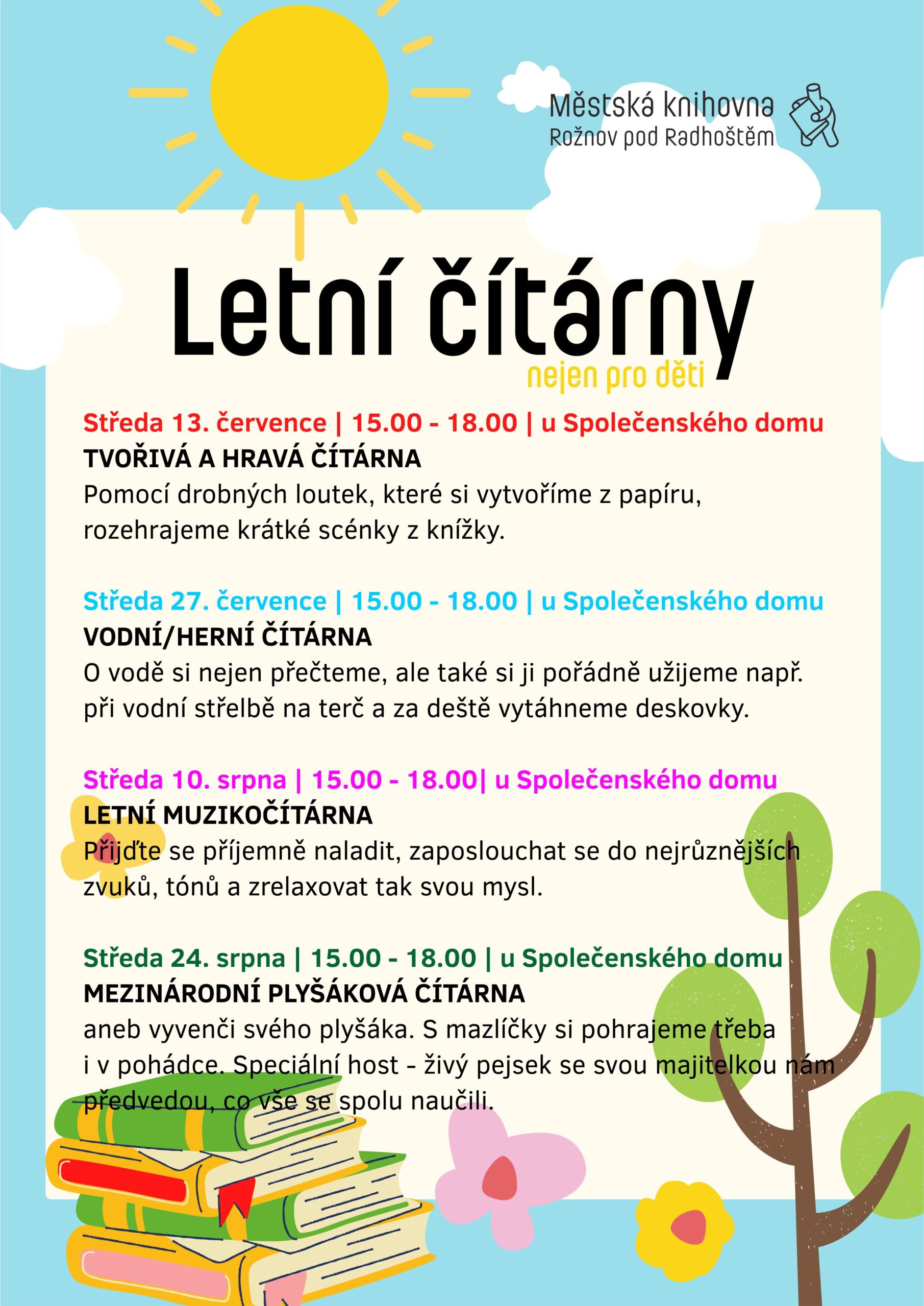 Ve středu 24. srpna proběhne poslední díl Letní čítárny. Aneb „vyvenči svého plyšáka“. Doneste svého oblíbeného plyšáka, inspirujte se čtenou pohádkou a zahrajte si dle své fantazie s ostatními plyšovými mazlíčky. Na závěr si můžete své mazlíčky vyměnit v „burze plyšáků“. Hostem bude Blanka Kopřivová s živým pejskem a předvede nám, co vše lze takového domácího mazlíčka naučit. Akce se uskuteční u Společenského domu.