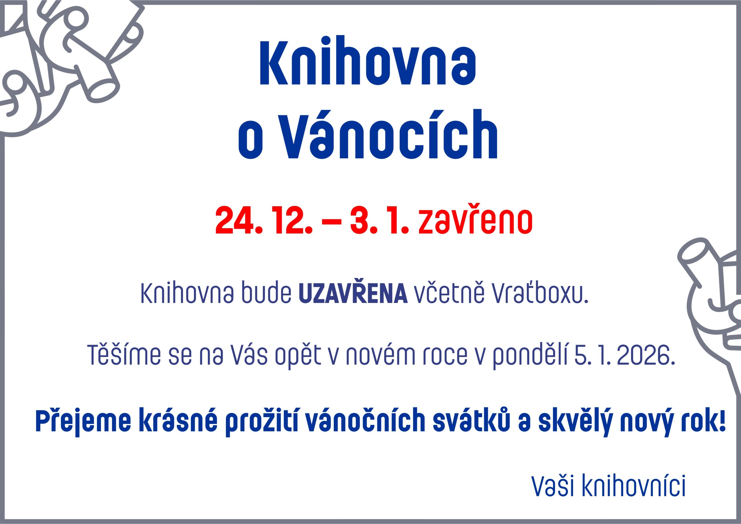 Od 24. prosince do 3. ledna bude naše knihovna uzavřena. Spolu s knihovnou bude uzavřen i Vraťbox. Těšíme se na Vás opět v novém roce v pondělí 5.1. 2026.